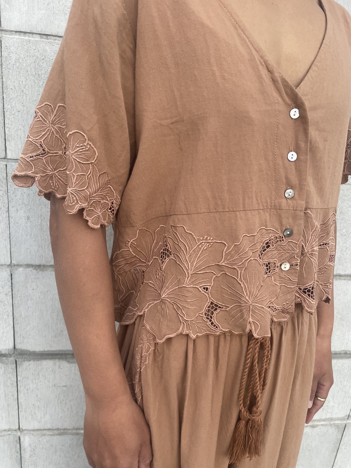 繊細なハイビス柄が袖先と裾まわりに施されており、シンプルながらも華やかさを演出します。