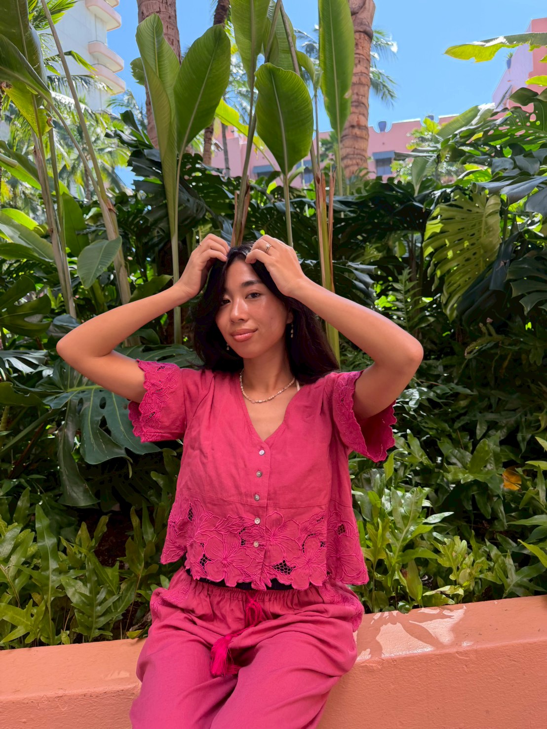 コーディネートの幅が広がるこのカットワーク半袖トップスは、単品で着るのはもちろん、同素材のボトムスとセットアップで着用すれば、さらに統一感のあるスタイルを楽しむことができます。