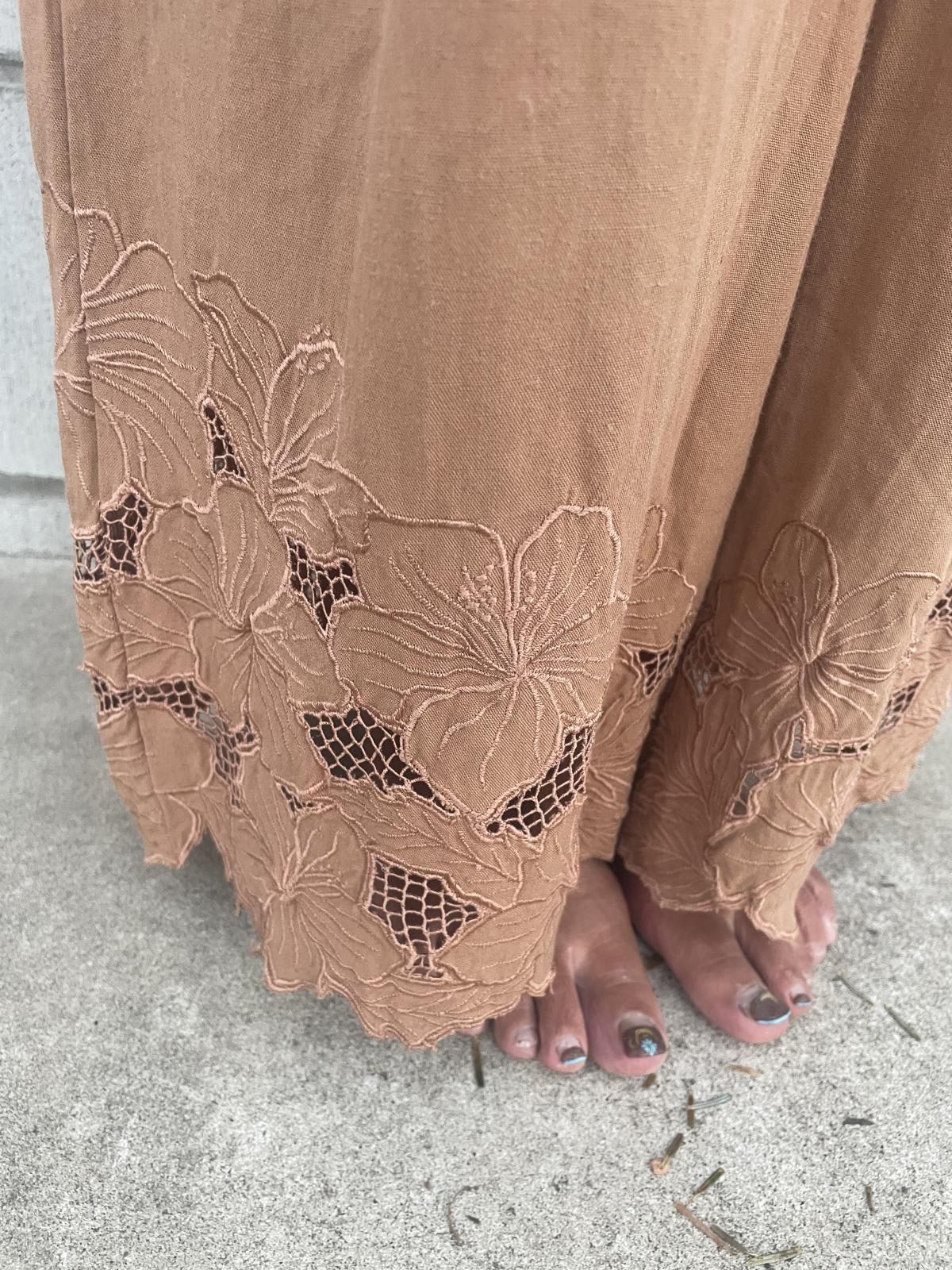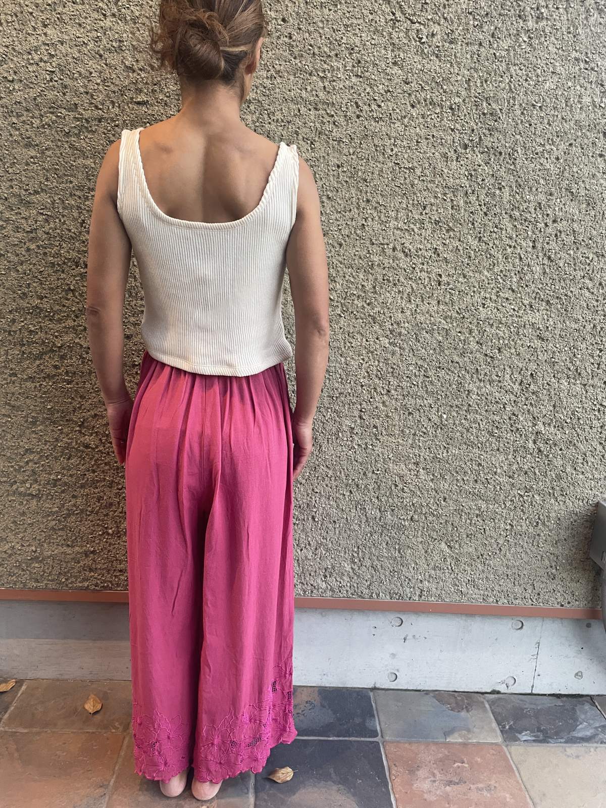 今年も多くのお客様にご好評をいただいている、ハイビスカスモチーフのデザインが特徴的なこのパンツは、リネンとレーヨンの混合素材を使用しており、暑い季節でも快適に過ごせます。