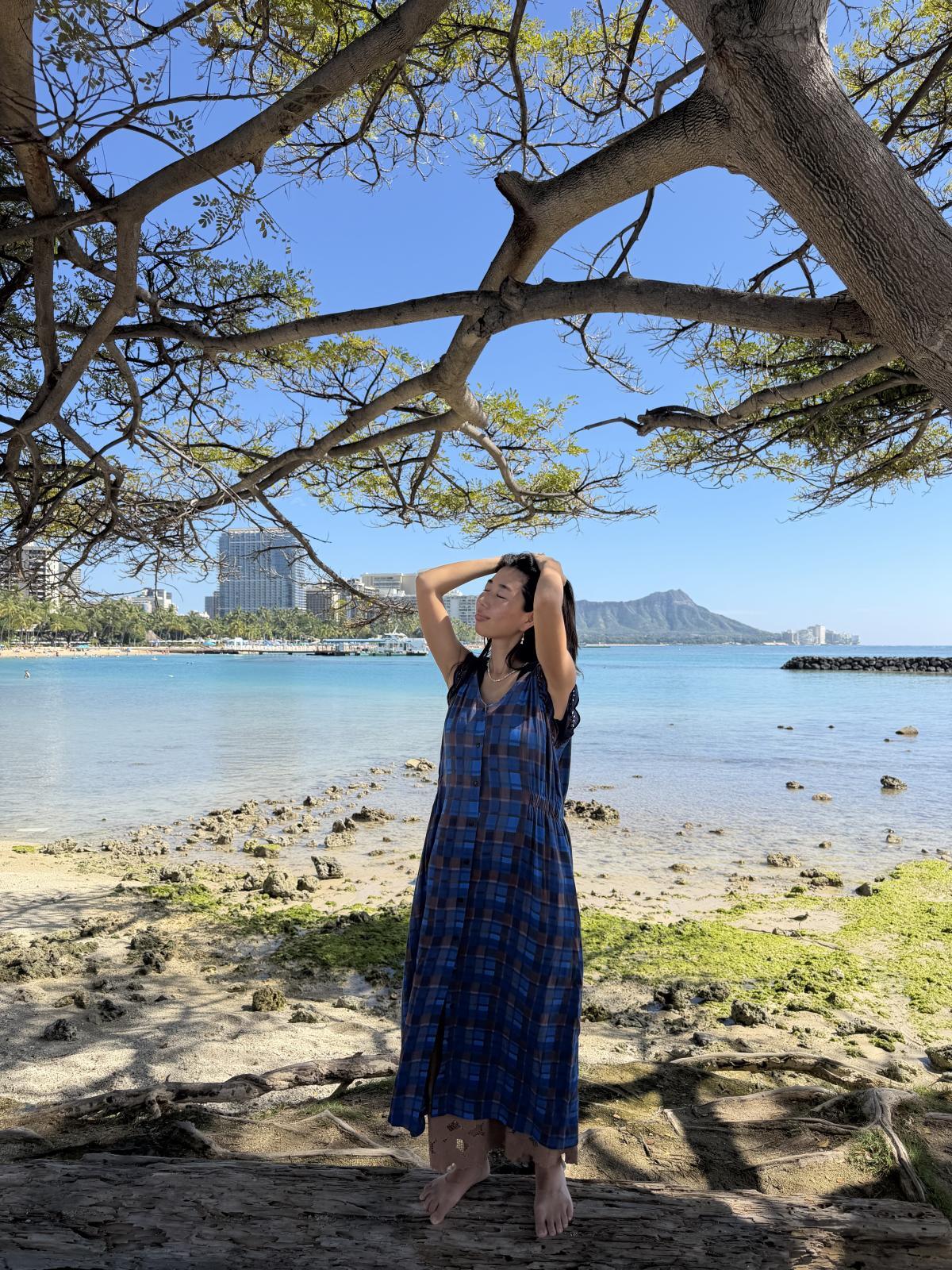 オリジナルデザインのチェックプリントは、リネンとレーヨンを絶妙にブレンドした生地から作られており、肌触りはさらりと軽やか。通気性に優れ、暖かい季節でも快適に過ごせます。