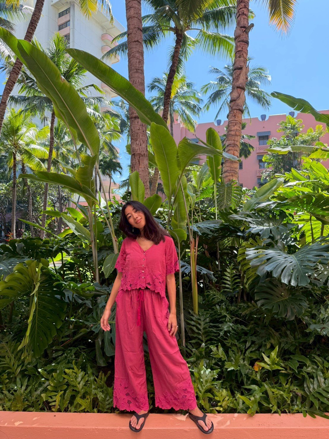 このデザインによってパンツ全体に軽やかさと華やかさが加わり、ビーチやリゾート、タウンにもぴったりの印象を与えてくれます。